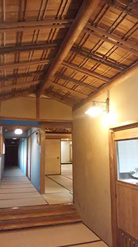 今日は海の日です。山中温泉は山のイメージですが橋立港にも車で25分位です。無限庵玄関の腰板には舟板が使われています。湿気を考慮してあります。また御殿の間につながる廊下の天井は舟底形になっています。童謡にも(海にお船を浮かばせて行ってみたいなよその国)とあるように明治末期から大正初め、この建物が建てられた頃は海の向こうの外国に憧れていたのでしょうね。 |