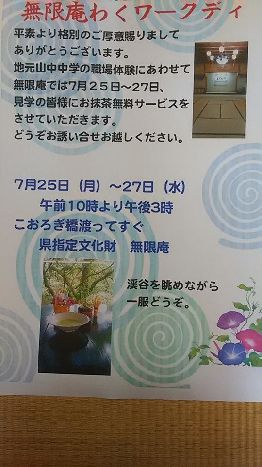 北陸地方も先週梅雨明けして今日も暑いです。明日から地元山中中学校の2年生ふたり職場体験に来ます。館内の説明や案内、清掃などします。またこの職場体験期間は見学のお客様に中学生がお抹茶を無料でお出し致します。中学生の職場体験の様子も明日から紹介していきます。 |