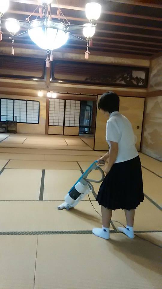 職場体験も2日目になり中学生も慣れて来ました。今日は館内を掃除機をかけてくれたり拭き掃除もしてくれました。お茶のお点前にも挑戦してみました。明日もう1日、頑張ってくださいね。 |