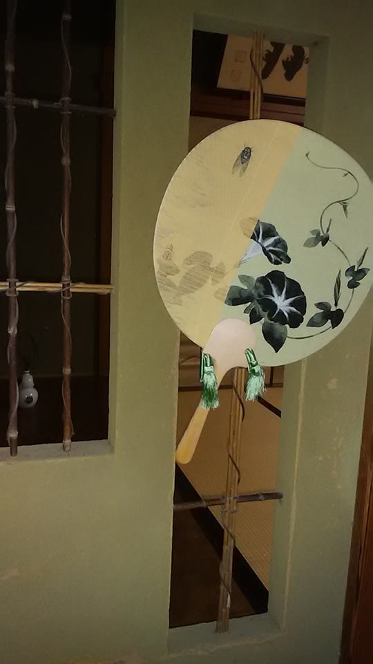 今日8月7日立秋です。えー立秋??暑すぎます。無限庵では毎年恒例で見学のお客様に涼を感じていただこうと大うちわを飾ります。館内のお花で立秋を少し味わっていただけたらと金水引や桔梗、藤ばかまを籠花入れに生けました。 |