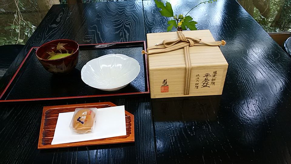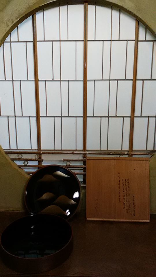 山の日です。山中温泉はその地名のように四方、山に囲まれています。民謡山中節にも[山が高うて山中見えぬ山中恋しや山憎や]と唄われています。表千家惺斎宗匠が大正10年山中温泉お越しの際山中木地師築城良太郎氏に糸目挽き大ジキロを作成依頼し京都に持ち帰り宗哲氏に内黒に塗ってもらい山中温泉の記念に遠山蒔絵にした物です。現在無限庵にて展示しております。 |