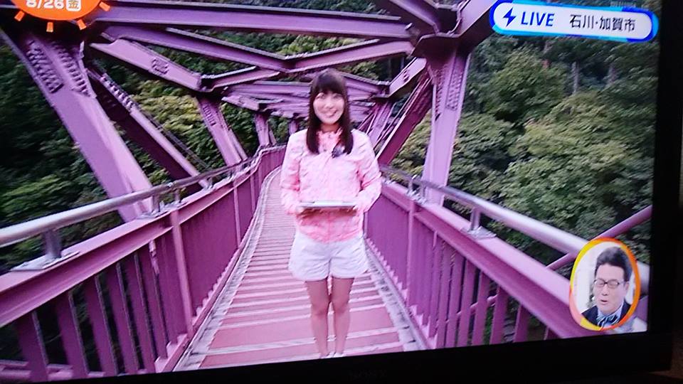 今朝めざましテレビで山中温泉あやとり橋が放送されていました。1991年草月流3代家元勅使河原宏氏が設計されて、当時宮沢りえさんが渡り初めされました。あやとり橋から鶴仙渓を歩き15分ほどで無限庵やこおろぎ橋につきます。無限庵御殿の間の縁側でちょっと腰を下ろしてゆっくりしてはいかがでしょうか。 |
