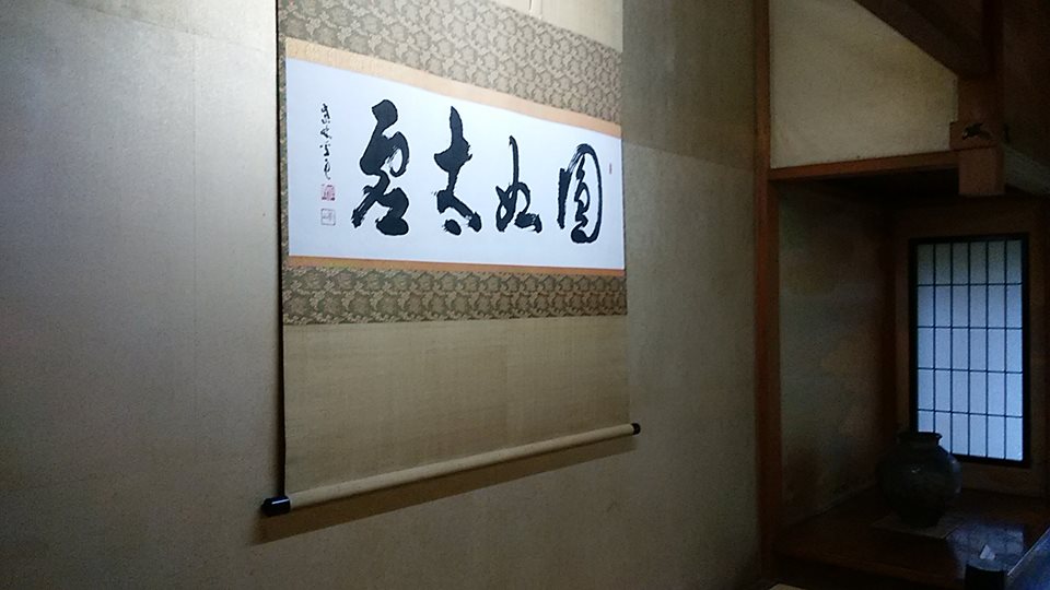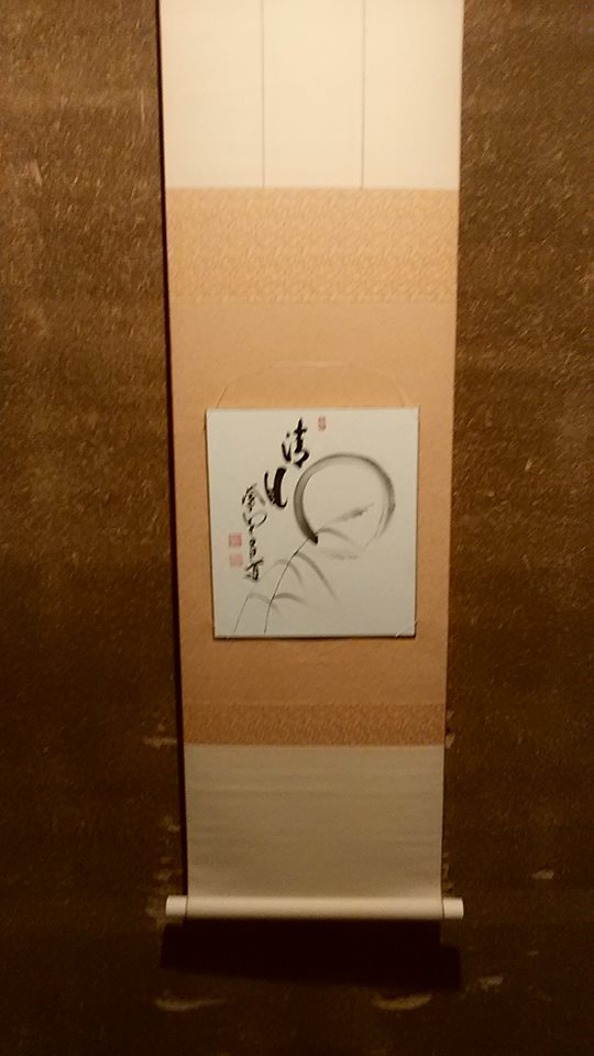 今日から9月です。暑かった夏から深まりゆく秋へと季節のバトンタッチです。夏茶碗も片付けまして、秋らしいお茶碗と入れ替わりです。10月には中置き、11月には炉開きとお茶席もかけ足で晩秋になりそうです。小間には大徳寺瑞峯院様の色紙をかけました。 |